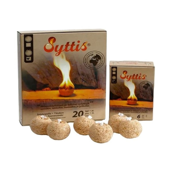 Aanmaakhout Syttis is een zeer effectieve, milieuvriendelijke en geurloze aanmaakbol uit Finland. De Syttis bol is gemaakt van resthout en paraffine zonder petrochemische stoffen en geschikt voor het aanmaken van alle soorten vuur. Simpel in gebruik! Of je nu hout, kolen of briketten gebruikt als brandstof, deze aanmaakbollen van Syttis zorgen ervoor dat je elk vuur snel kunt laten ontbranden. Je kunt de bol eenvoudig aansteken door middel van een aansteek houtje met magnesium. Vervolgens zal de bol minimaal 15 minuten branden door de vorm en samenstelling van het materiaal. Door deze lange brandtijd en de hoge kerntemperatuur ontbrandt zelfs vochtig brandhout. Ideaal dus voor het aanmaken van een kampvuur, barbecue, open haard of stove. Milieuvriendelijk De bollen zijn gemaakt van paraffine en resthout en zijn dus volledig vrij van chemische stoffen. Hierdoor komt er ook geen roet, rook of stank vrij wanneer je het vuur aanmaakt. Zelfs de verpakking van de bollen kan milieuvriendelijk verbrand worden.