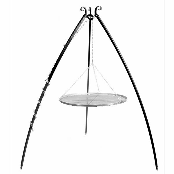 Driepoot van staal hoog 200 cm met grillrooster van RVS om boven het vuur te kunnen hangen. De driepoot, ook wel vuurstatief genoemd, is gemaakt van hoogwaardig staal. Het statief is opklapbaar en is 200 cm hoog en is 160 cm in doorsnede uitgeklapt.