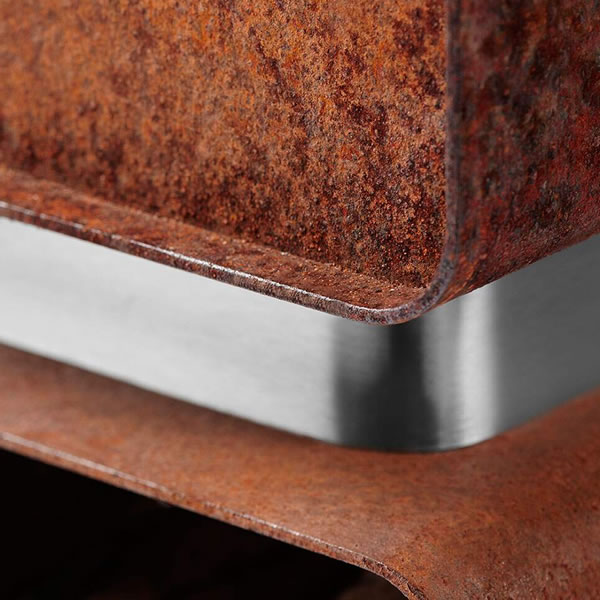 De 2 kubusvormen worden samengevoegd door een metalen band, gemaakt van geborsteld hoogwaardig RVS. Zodra het roesten intreed van het cortenstaal, zal de roestvrijstalen afstandhouder een schitterend contrast creëren tussen de kubussen van het cortenstaal en de geborstelde afwerking van het roestvrij staal.