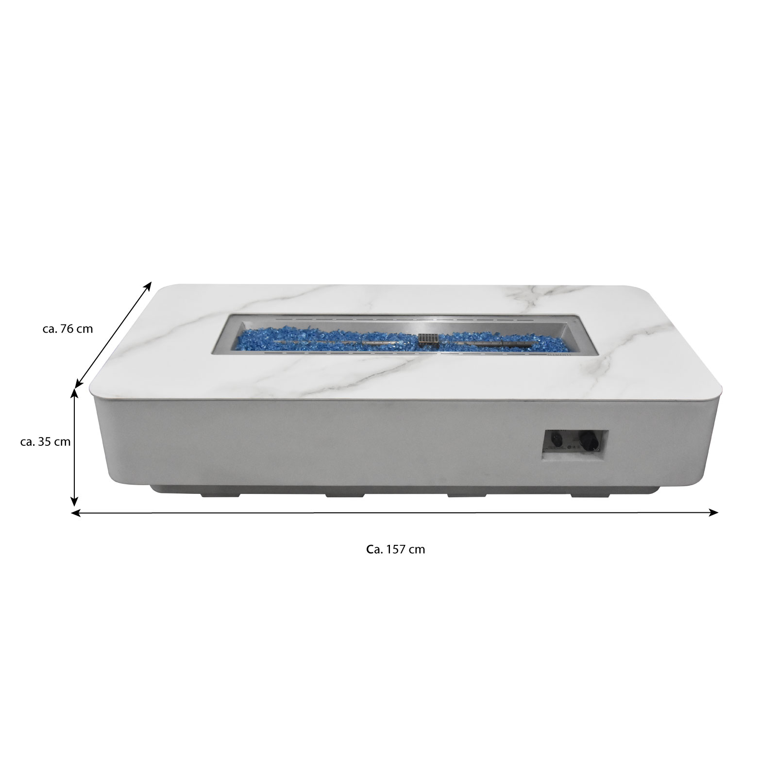 Prachtige stijlvolle vuurtafel op gas met een witte marmerlook van het exclusieve merk Elementi. De haard Athene is een hoogwaardige premium gashaard uit de ELEMENTI+ serie. De romp van de haard is gemaakt van robuust vezelbeton en het tafelblad is gemaakt van edele keramiek.