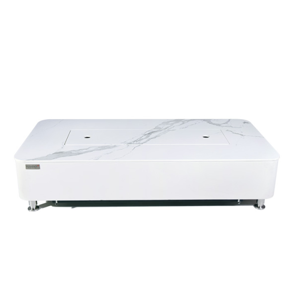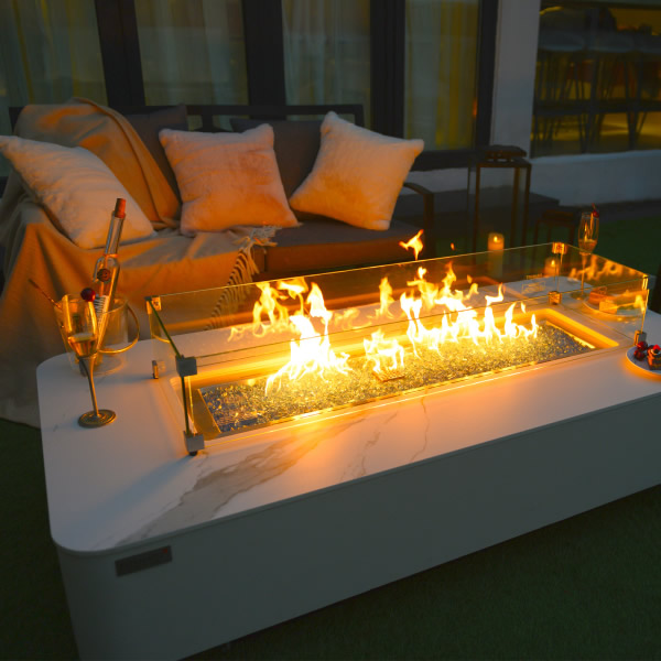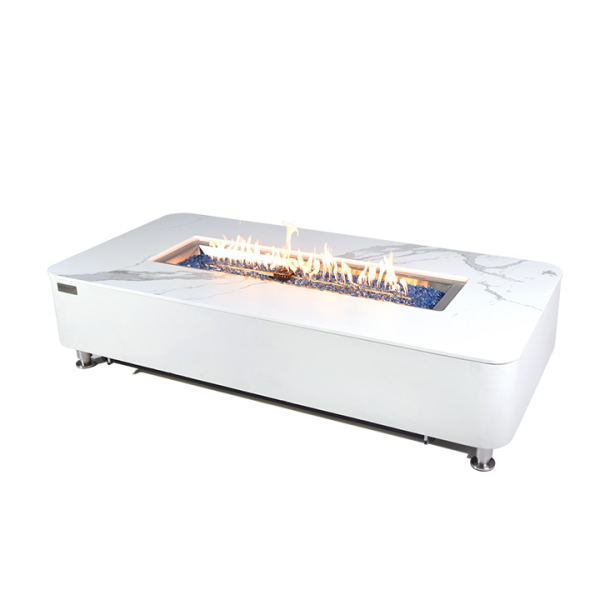 De luxe haard Athene is ontworpen in een elegante, rechthoekige vorm met afgeronde hoeken. Het oppervlak van het tafelblad is glad gepolijst en uitgevoerd in marmerlook, wat de gashaard een nobel karakter geeft. In het midden van de haard bevindt zich een brander met een bijzonder hoog verwarmingsvermogen. De decoratieve glassplinters die er bovenop zijn geplaatst, geven het vuur een buitengewone uitstraling. Wanneer de haard niet in gebruik is, kan de brander perfect worden afgedekt met het bijgeleverde deksel en kan hij gewoon als tafel worden gebruikt.