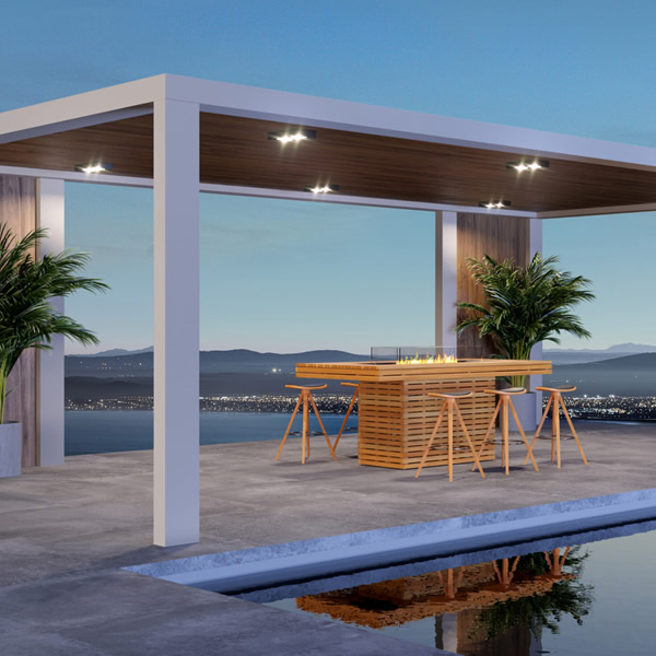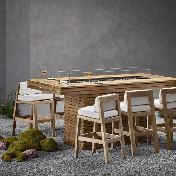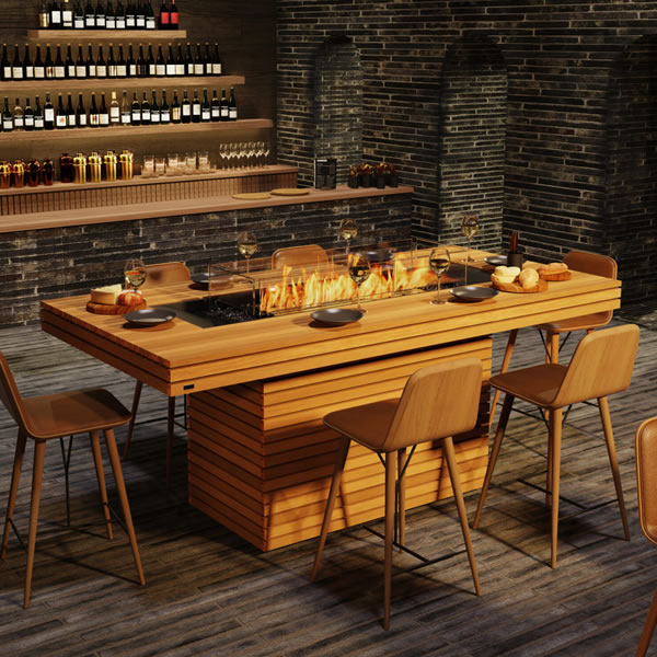 Perfect geproportioneerd als een functionele, vrijstaande eettafel, voegt de EcoSmart GIN BAR Teak vuurtafel een gevoel van luxe en stijl toe aan binnen- of buitenruimtes. Dit prachtige model is ontworpen met ruimte voor eetkamerstoelen die rond de tafel kunnen worden geplaatst en heeft een langwerpige vlam als middelpunt. Deze vuurtafel creëert een indrukwekkende manier om familie of gasten samen te brengen in een intieme en stijlvolle setting.